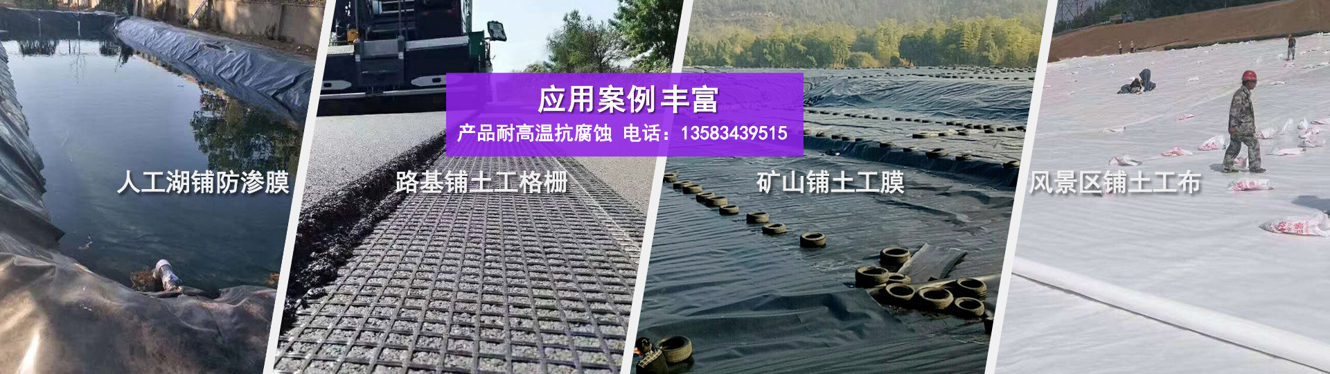 產(chǎn)品廣泛用于: 1.環(huán)保環(huán)衛(wèi)工程(如生活垃圾填埋場防滲、污水處理廠、有毒有害物質(zhì)填埋場、危險品倉庫、廠房等) 2.水利土木工程(河、湖、水庫、堤壩、堵漏、加固、水渠防滲、護坡等) 3.市政工程(地鐵、建筑物的地下工程和屋頂蓄水池、屋頂花園防滲、污水管道內(nèi)襯等) 4.園林綠化(人工湖、池塘、高爾夫球場的水塘底襯、護坡等) 5.石化(化工廠、煉油廠儲油池防滲防污、化學反應(yīng)池、沉淀池的內(nèi)襯、二次襯層、藥廠基建防滲與隔離) 6.礦業(yè)(洗選池、堆浸池、堆灰場、尾礦壩防滲防污等) 7.交通設(shè)施工(公路的基礎(chǔ)加固、涵洞的防滲) 8.農(nóng)業(yè)(水庫、飲用水池、蓄水池防滲、灌溉系統(tǒng)的防滲) 9.水產(chǎn)養(yǎng)殖業(yè)(魚塘、蝦池的內(nèi)襯等)